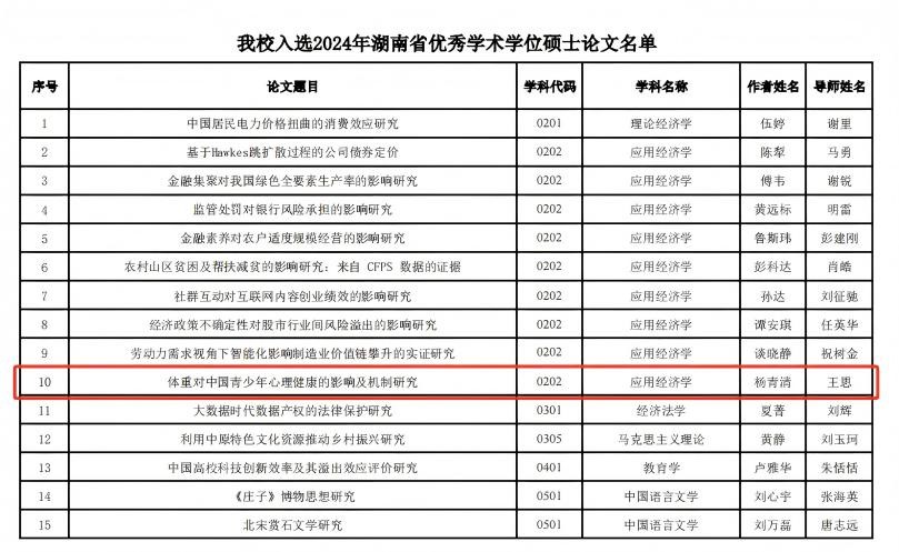 近日,湖南省教育厅公布了2024年湖南省优秀硕博学位论文评选结果。由我中心王思副教授指导,2019级硕士研究生杨青清的毕业论文《体重对中国青少年心理健康的影响及机制研究》,荣获2024年湖南省优秀学术硕士学位论文。目前该生已进入中国人民大学攻读博士学位。